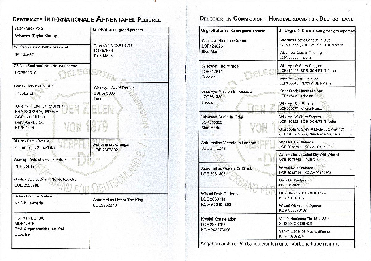 Ahnentafel meiner Collie Hündin Veni Vidi Vici "Triple V" vom Hause Melchert |