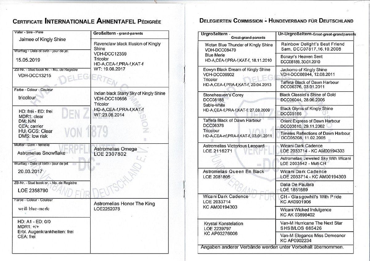 Geboren am 19.05.2023 Urmeli ist Kat. frei und ist: MDR1 +/+ DM +/+ CEA +/+ IPG +/+ HUU +/+ MH +/+ PRA +/+ GCS +/+ Scherengebiss, HD A1 ED 0 trägt kein Merle Gen ( Lokus m/m ) |